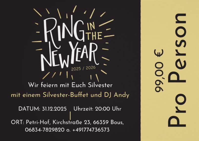 Ab sofort könnt Ihr euch die Karten im Petri-Hof Hotel Restaurant Events für 99 € p.P. sichern. (Nur BAR-Zahlung möglich)